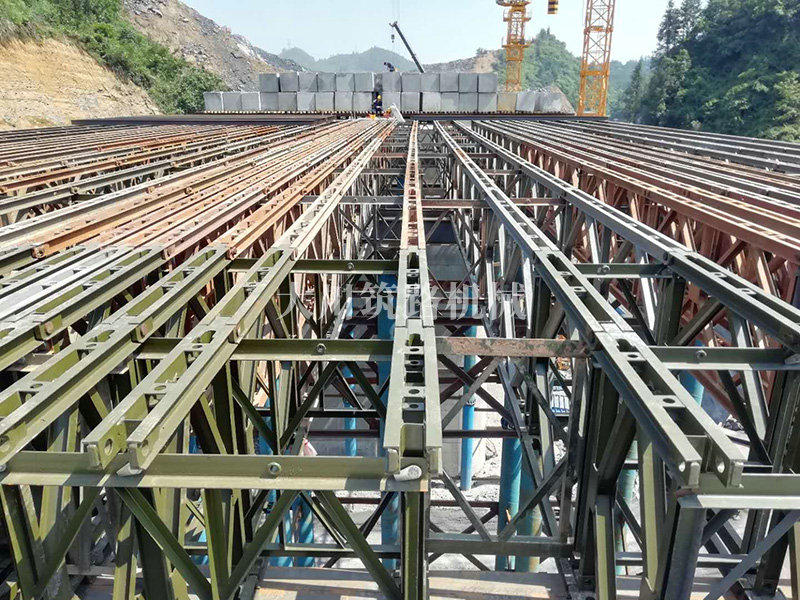 特點:現澆梁支架平臺的跨度大,高度高,施工現場場所地非常有限,在局促的場地中和其他施工隊伍的場地需交叉作業。安裝過程中因拼好的主梁沒有平整的場地放置,需要在拼好的貝雷片上面拼裝對接;有些梁也因場地原因致使吊機沒有好的停車位,不能整根梁吊裝,采用半根梁吊裝在空中對接方式完成安裝,施工難度較大。